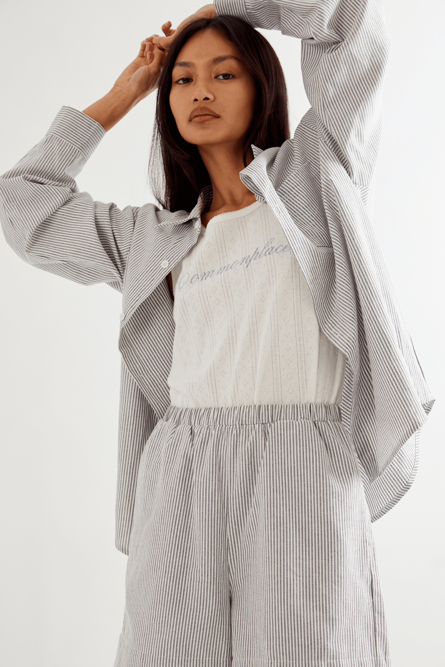 A striped shirt with and classic detailing. Pairs back to the matching shorts or everyday denim. 100% Organic Cotton.