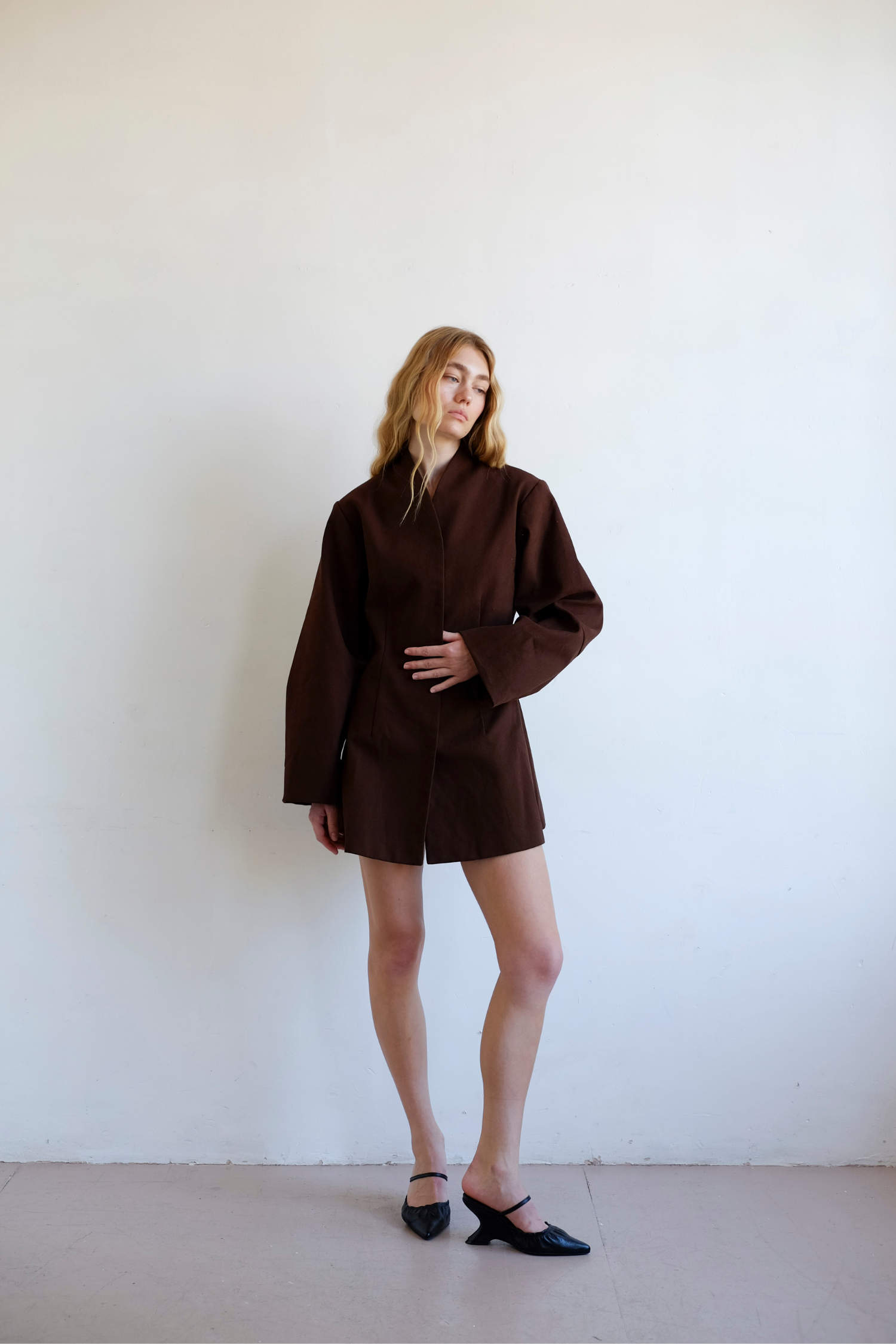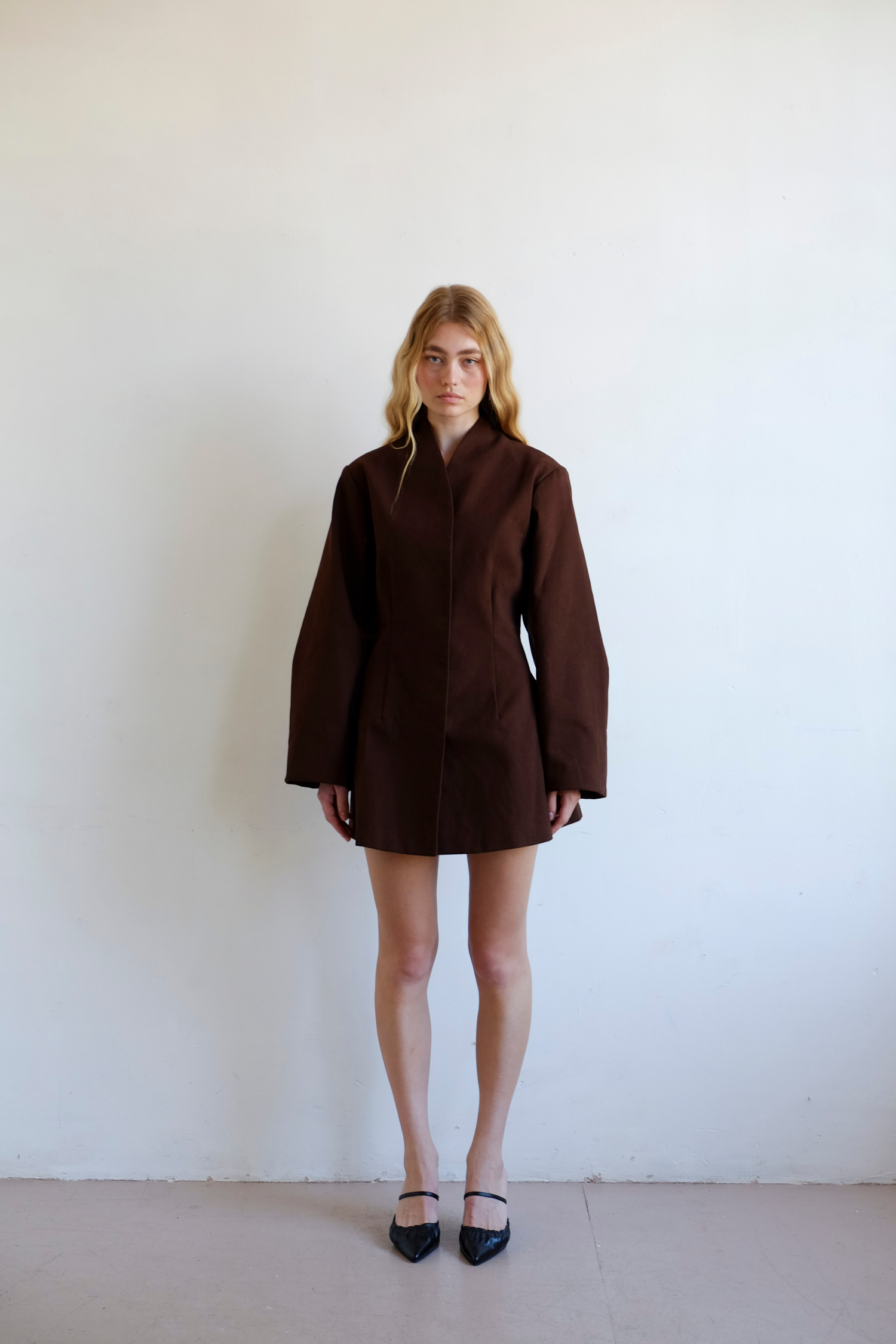 A softly structured twill dress in a rich chocolate tone. Minimal lines and an easy silhouette create a versatile staple - wear alone or over trousers. Model wears size Medium.