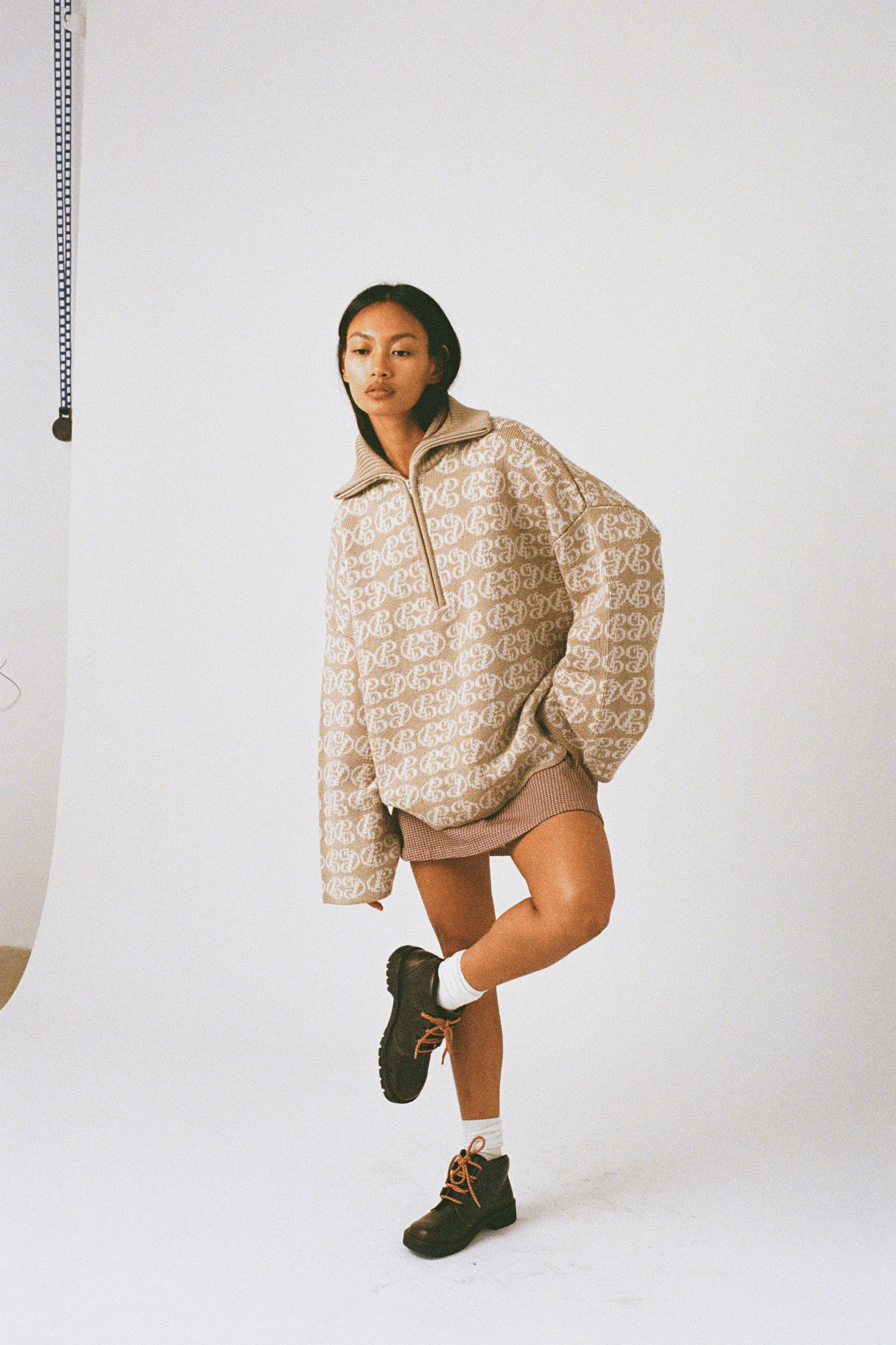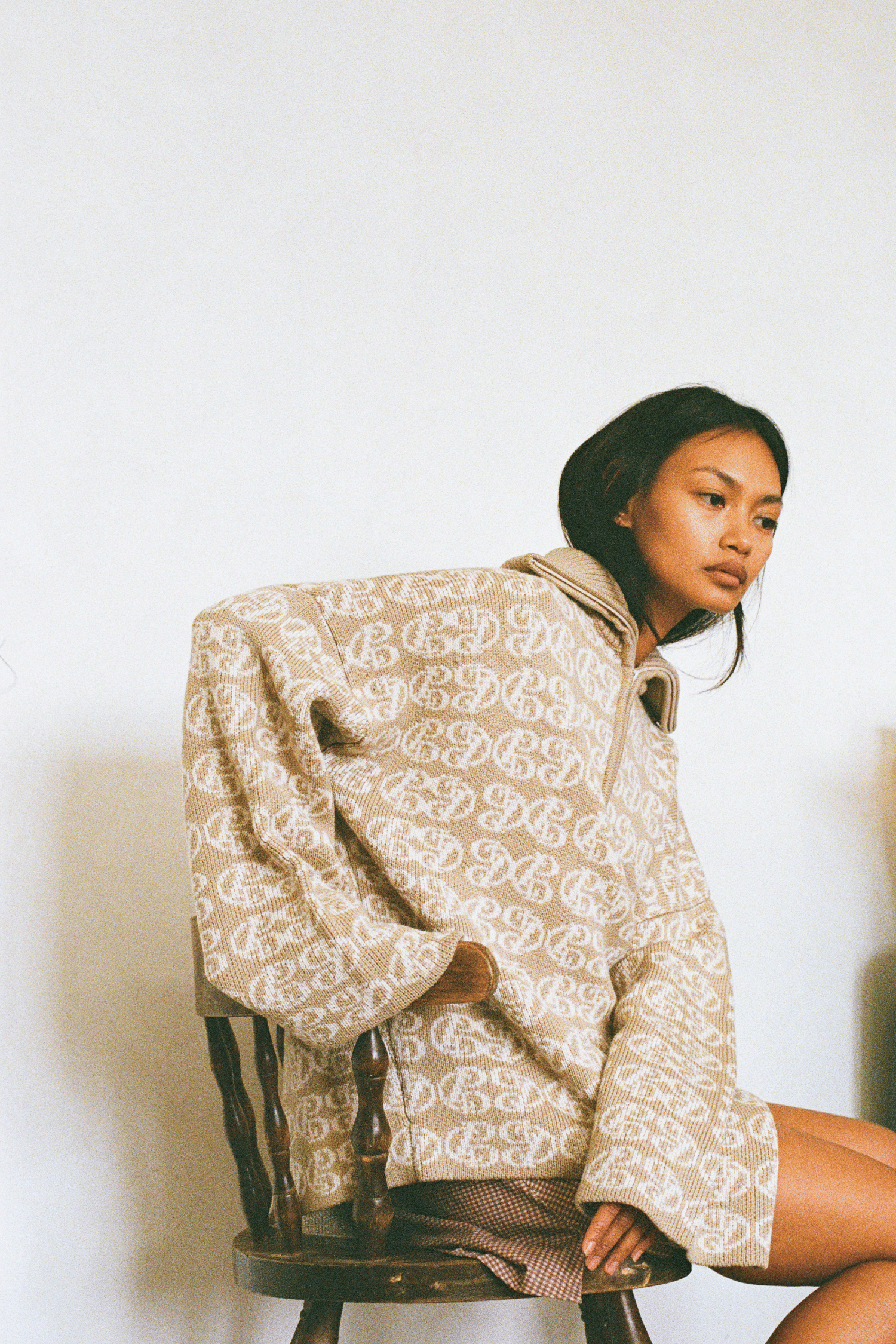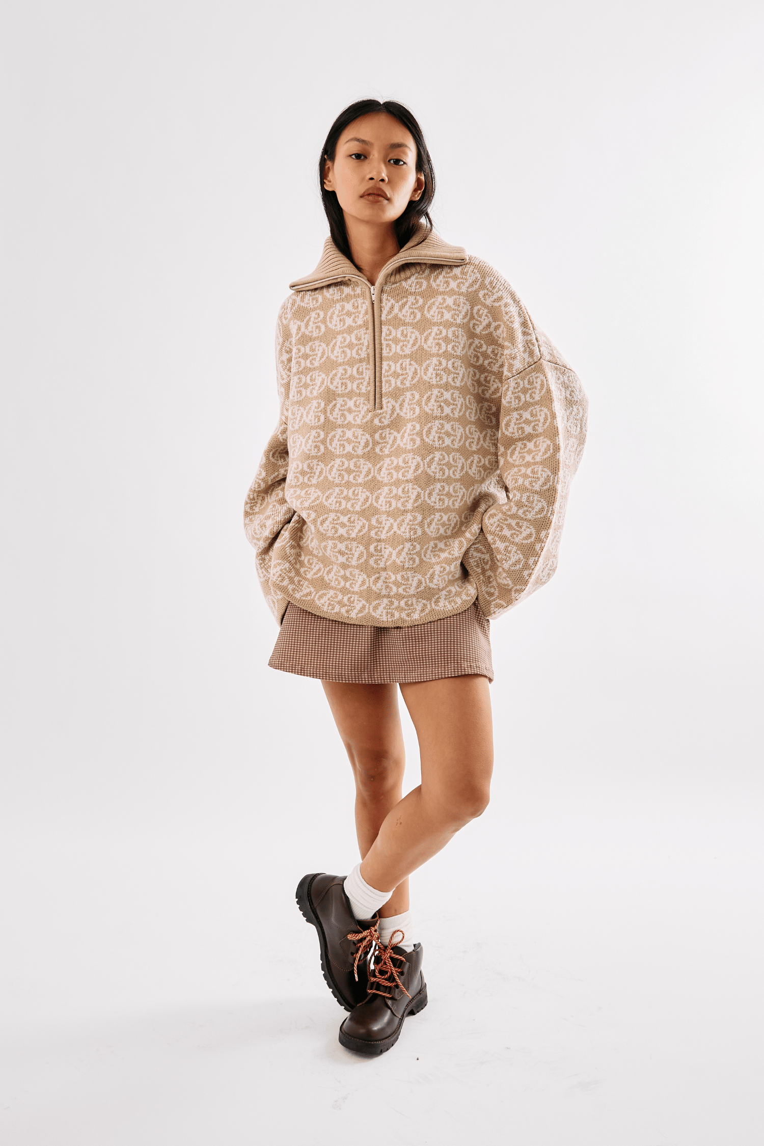 The knit of the season - our signature custom printed monogram paired with a 1/4 zip and exaggerated collar detail. Finished in heavyweight 100% merino wool.