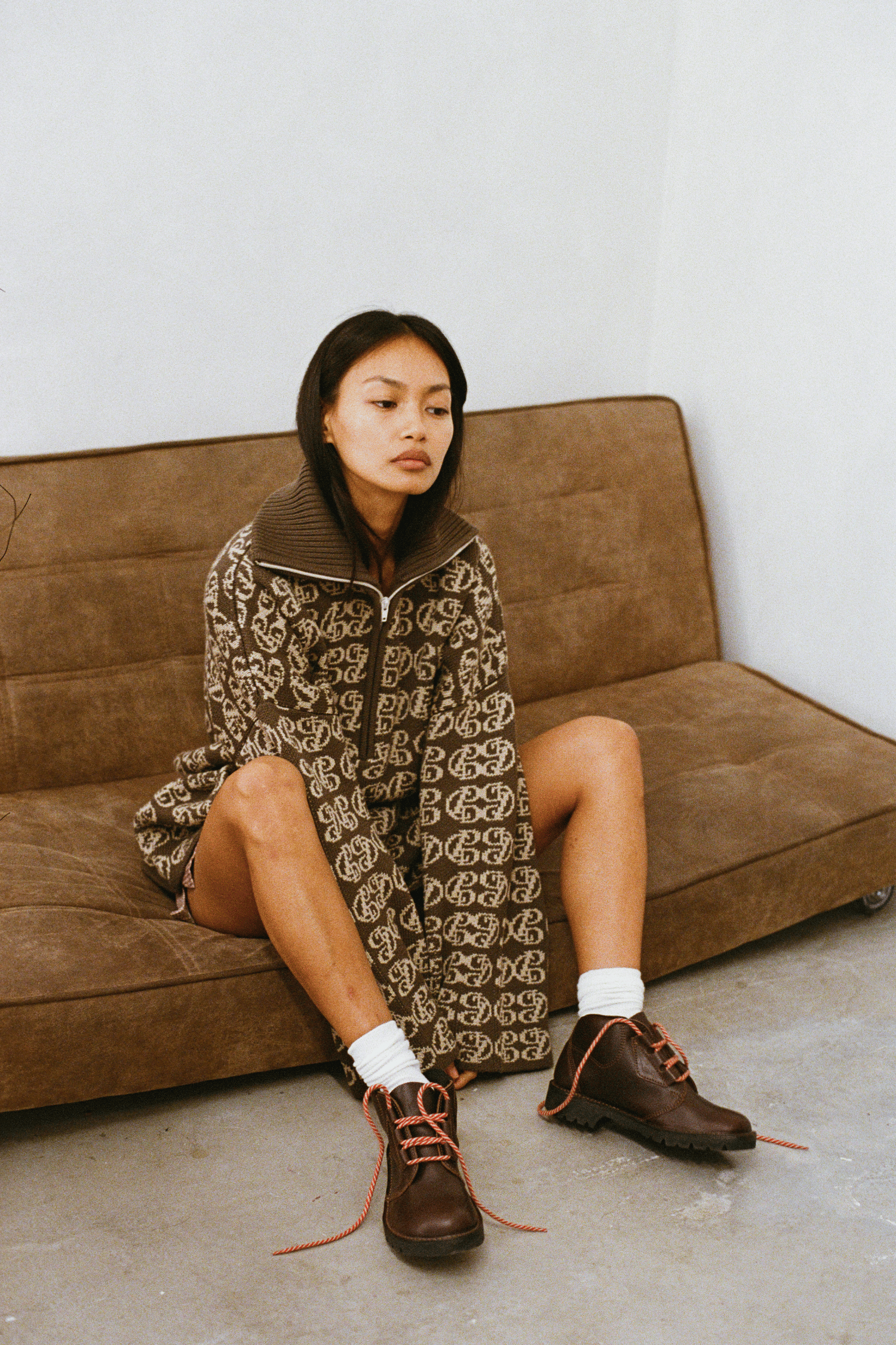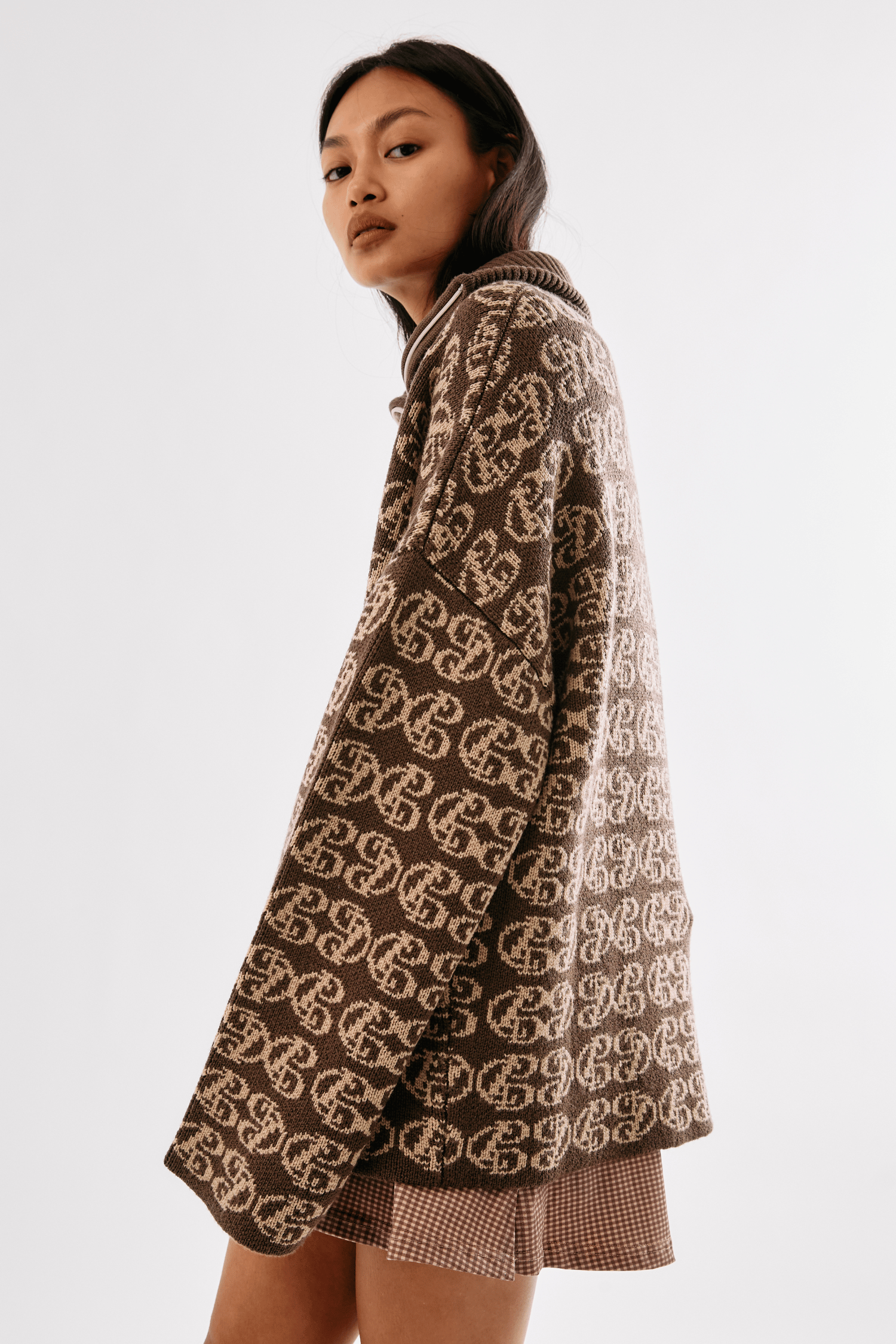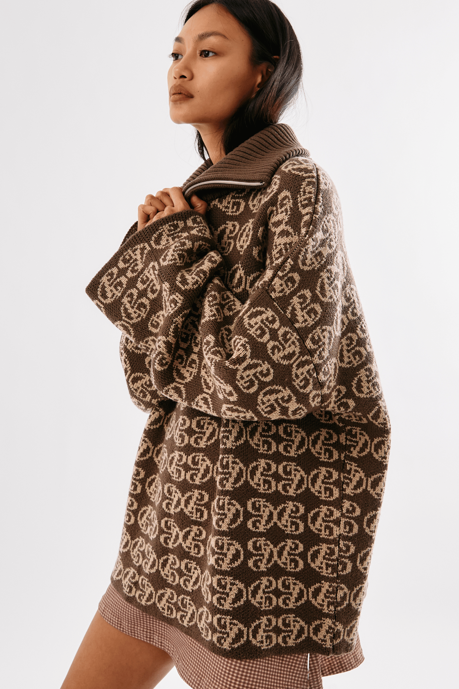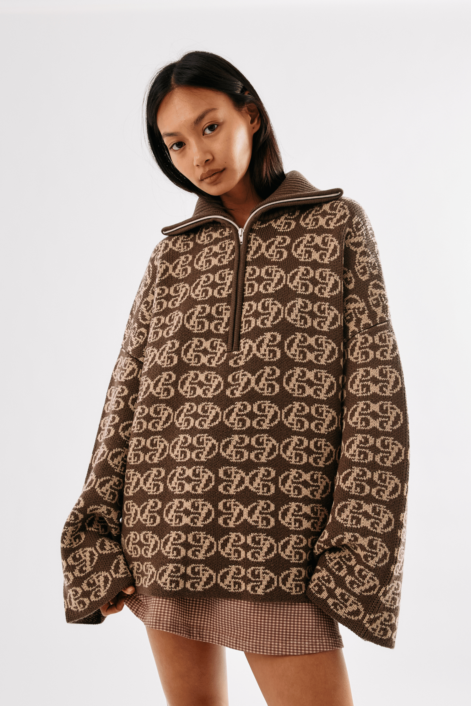 The knit of the season - our signature custom printed monogram paired with a 1/4 zip and exaggerated collar detail. Finished in heavyweight 100% merino wool.