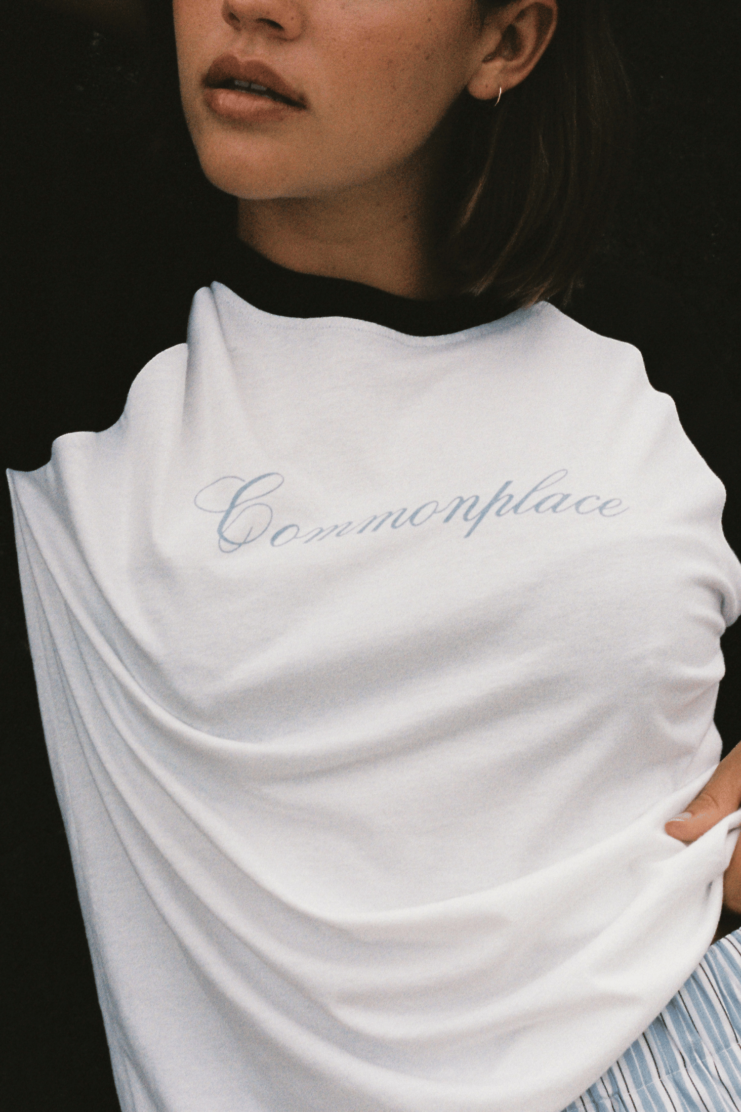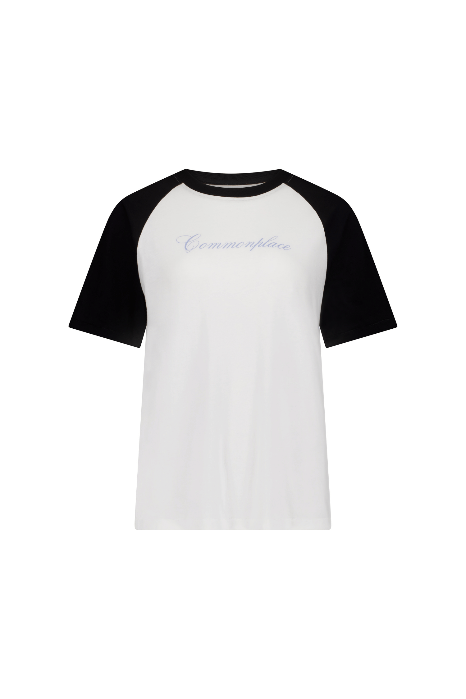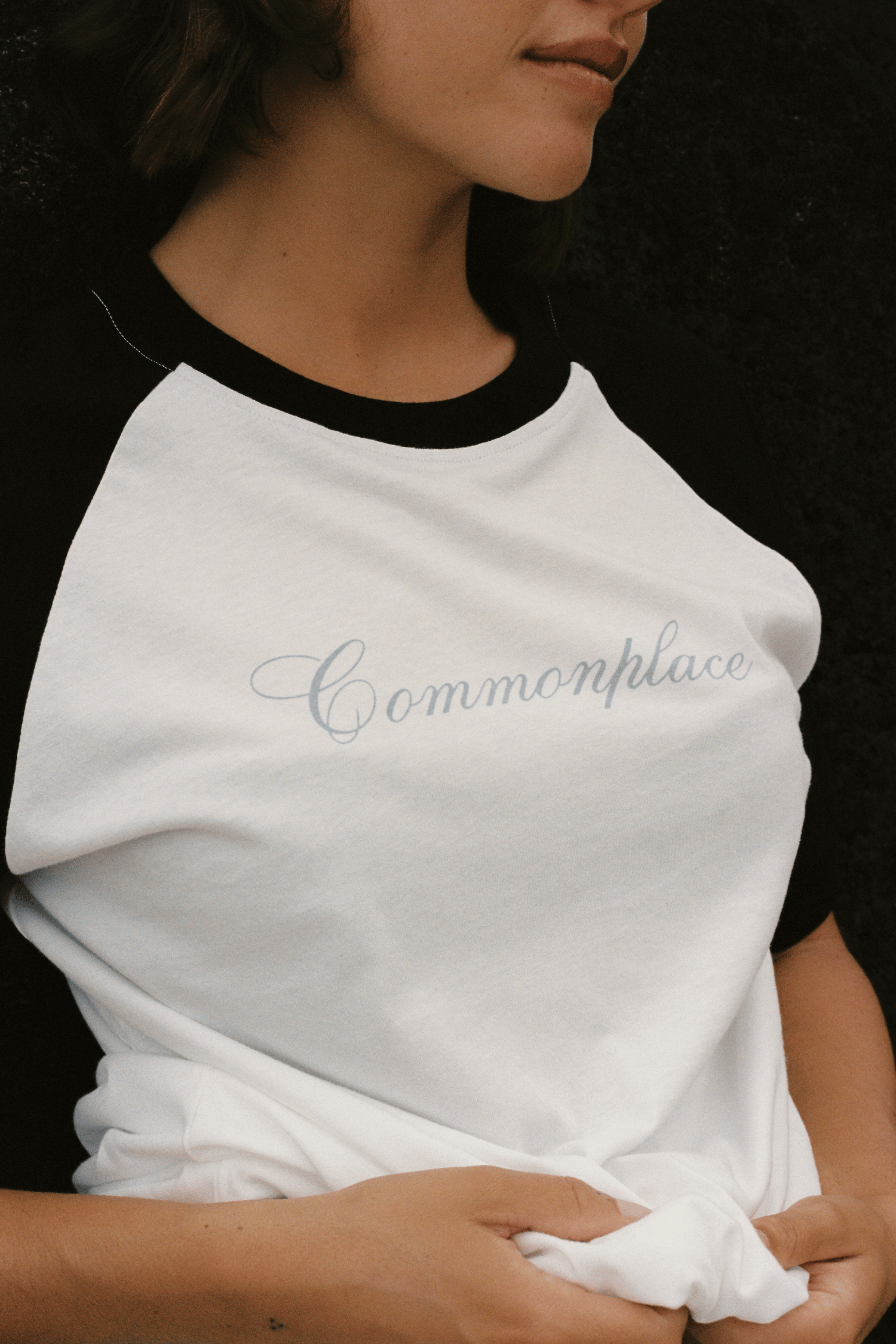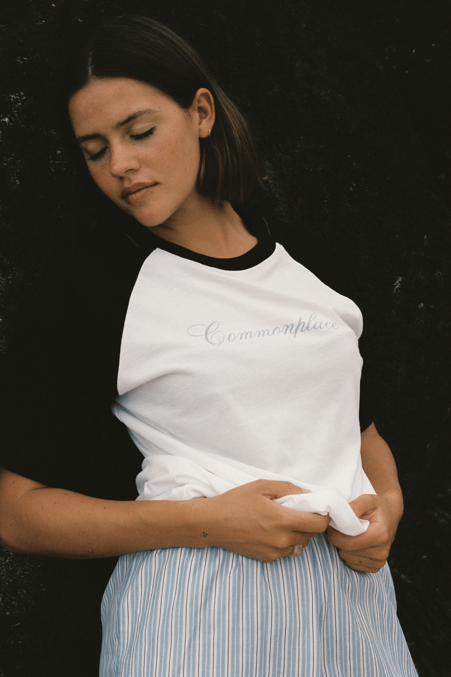 A vintage-inspired raglan with contrast sleeves and delicate cursive script. Soft, easy and quietly graphic - a piece to wear again and again. 100% cotton.