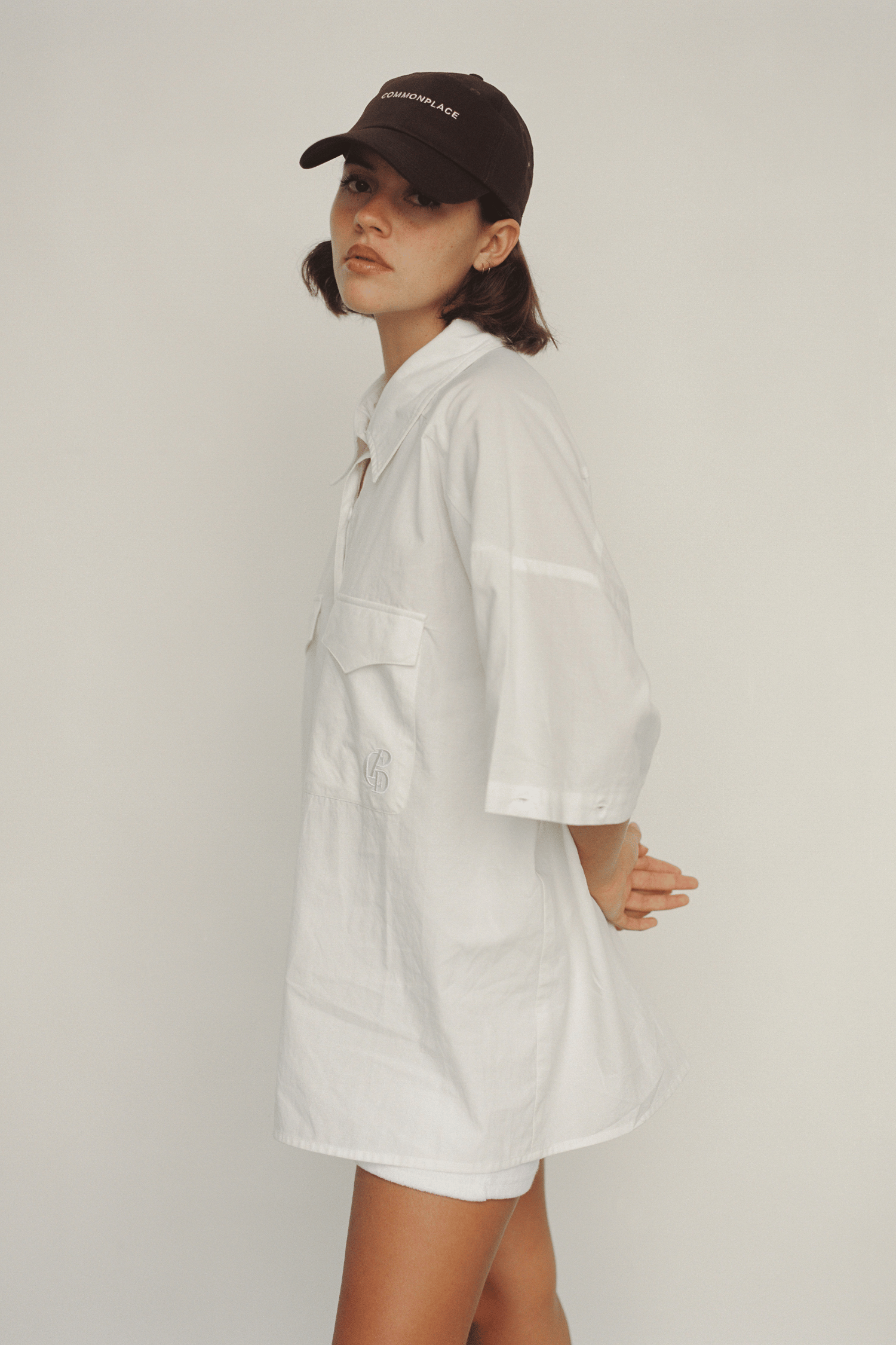 Mid-weight shirt with double front pockets and button-off sleeves for the ultimate summer versatility. Pair with the Terry Ruched Skirt for a relaxed yet polished summer lounge look.