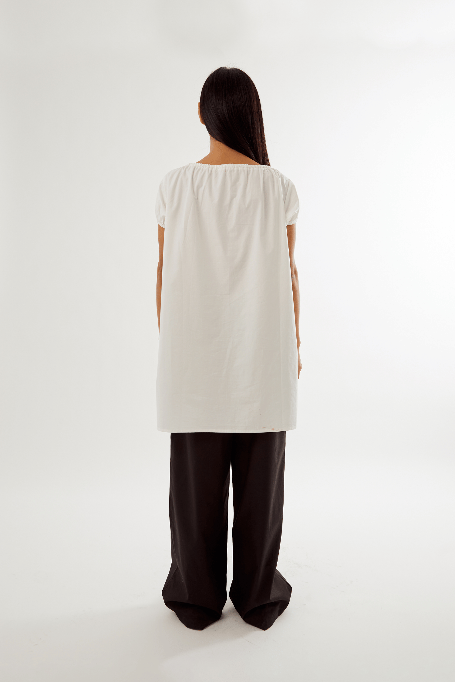 A breezy white puff sleeve dress with simple lines for movement and ease. Light, effortless, and endlessly wearable. 100% Organic Cotton.