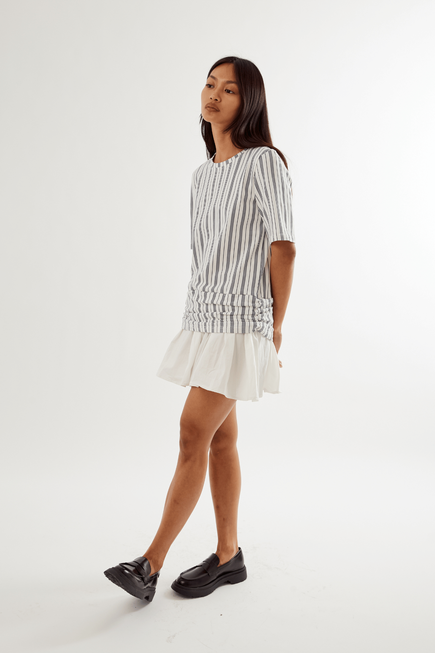 A playful drop-waisted style, finished with custom stripes and a crisp cotton poplin skirt. 100% Organic Cotton.