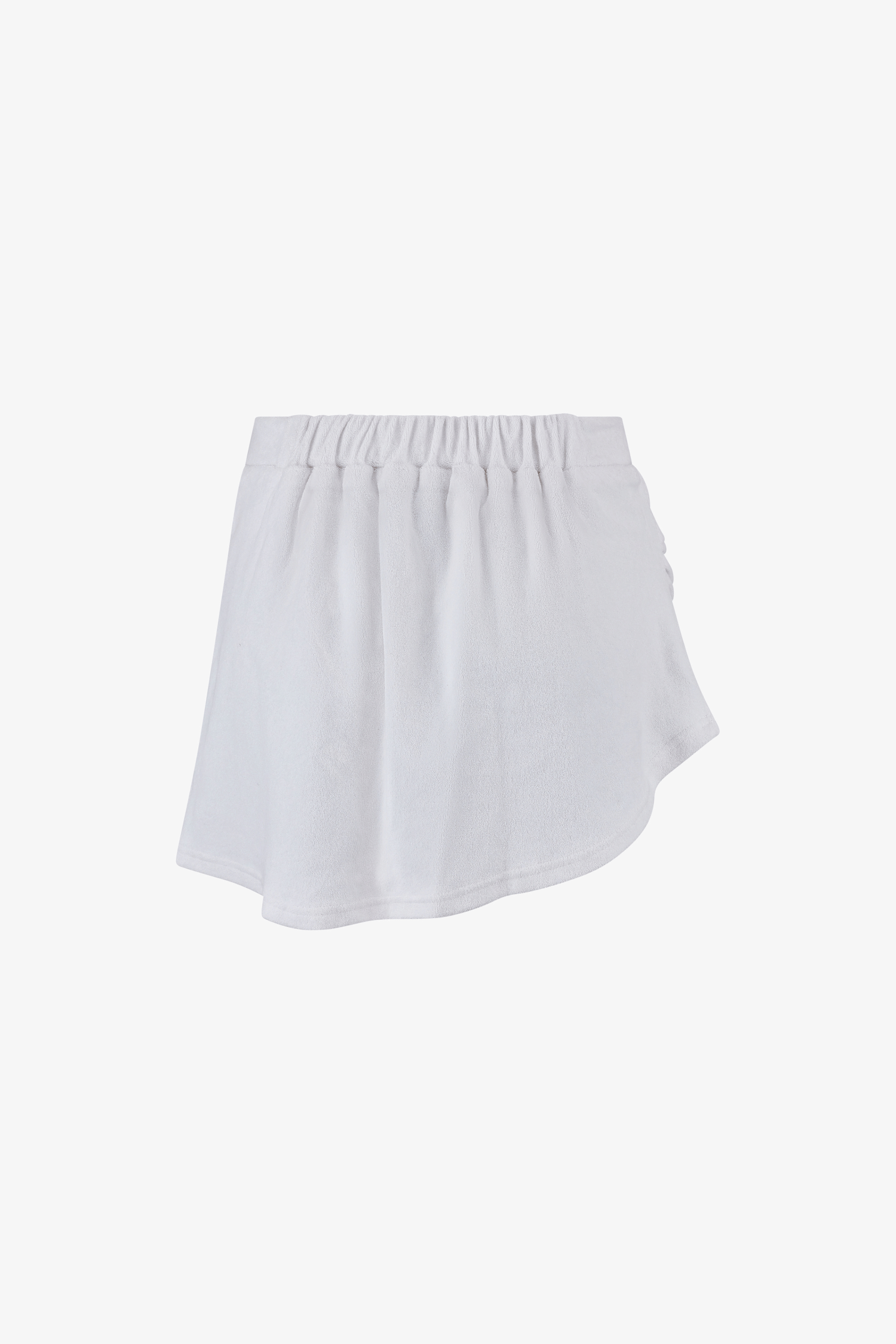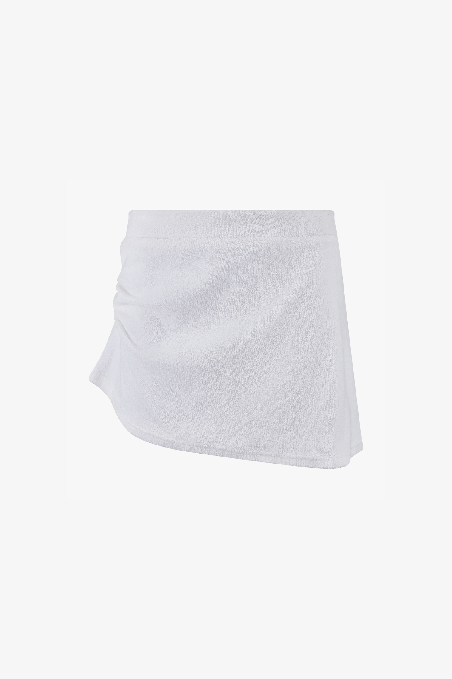 An easy pull-on style terry towelling mini with a relaxed elasticated waist and subtle ruched side detailing. Made in the perfect shade of white.